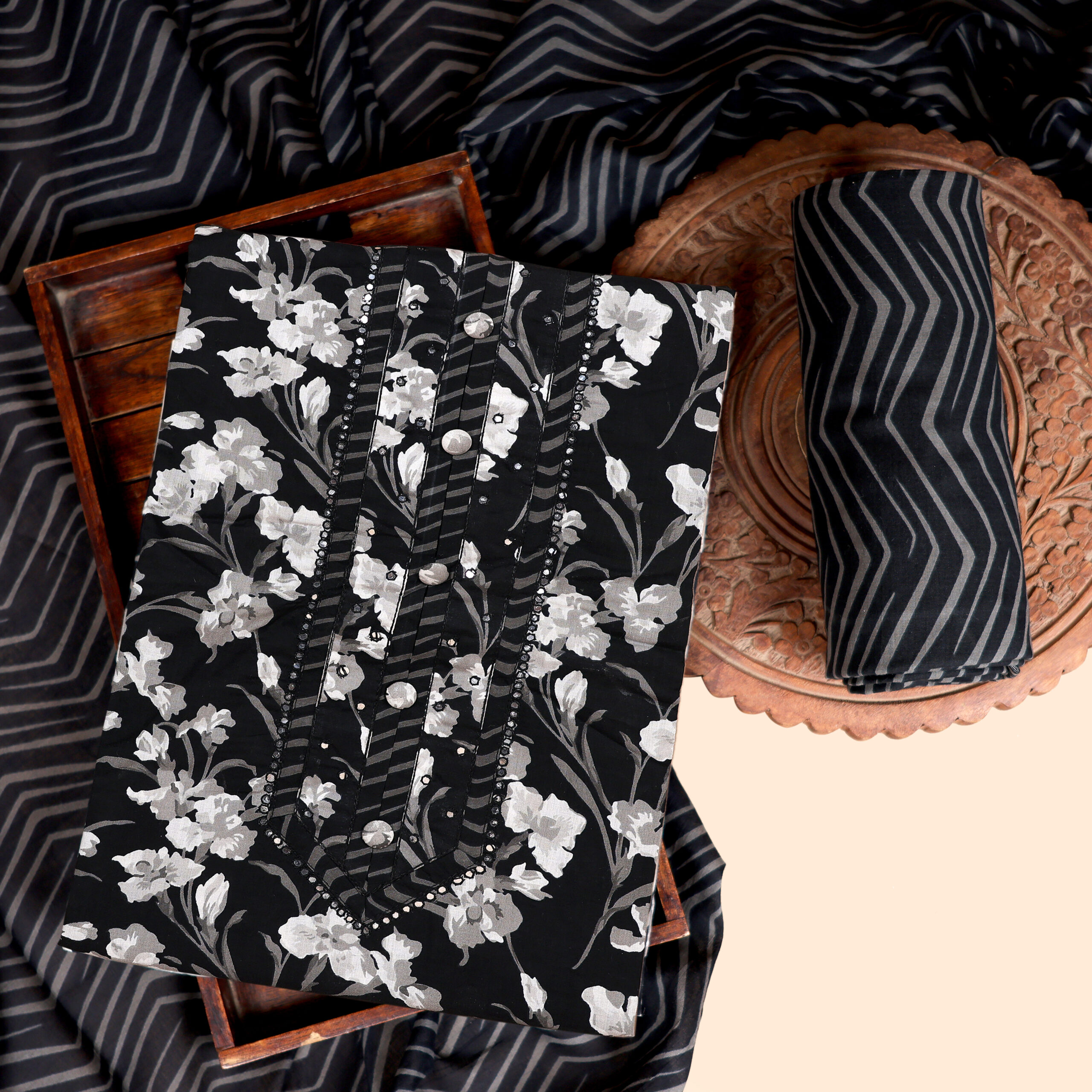 Elegant black & white floral printed unstitched suit set with matching dupatta and striped bottom fabric. Perfect for festive wear, office, or casual outings.