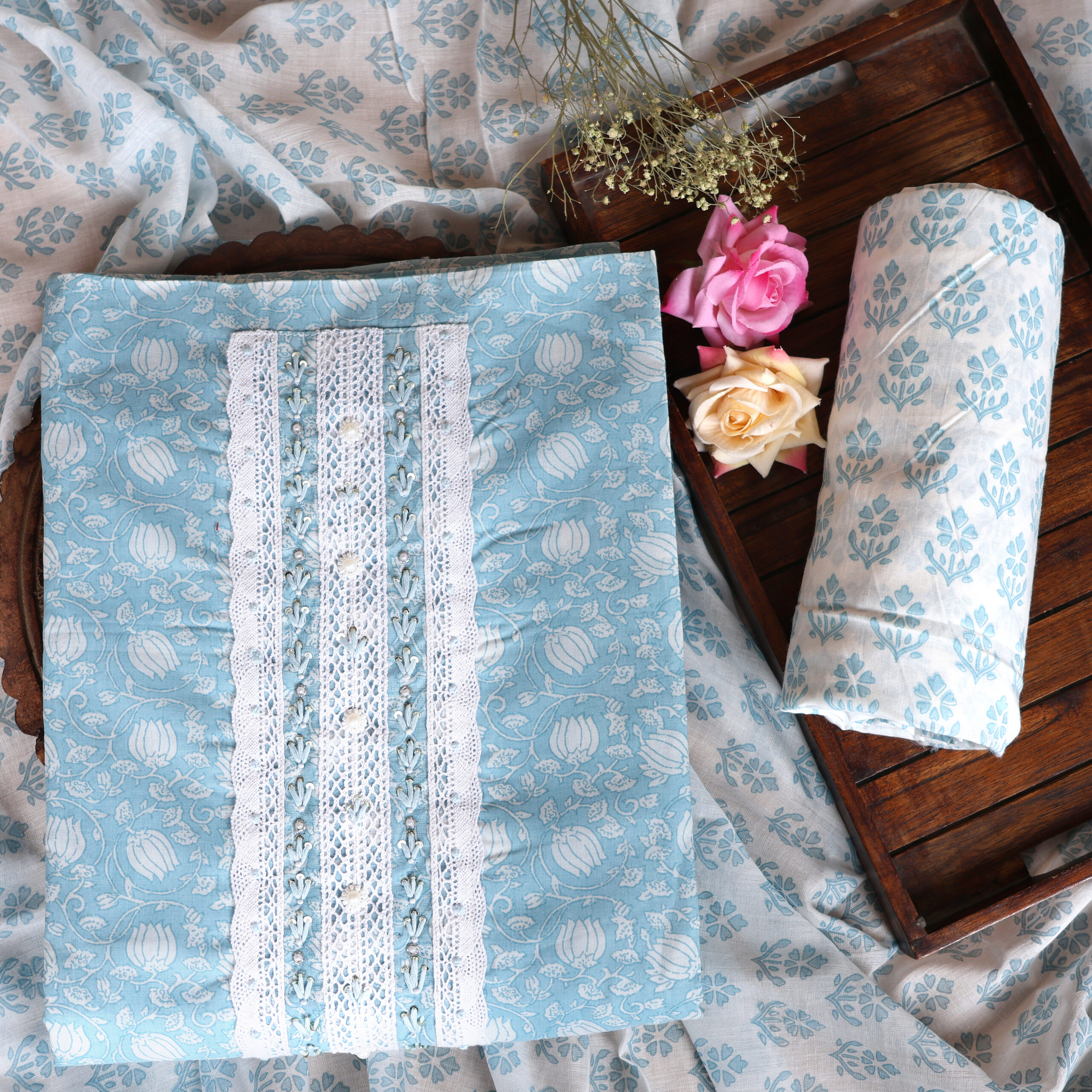 This suit set features a soft sky blue cotton base adorned with delicate floral block prints that reflect authentic Indian craftsmanship. The kurta piece comes with intricate lacework on the neckline, adding a touch of grace and sophistication. The dupatta showcases matching motifs with a beautifully finished border, making it the perfect companion to the ensemble.