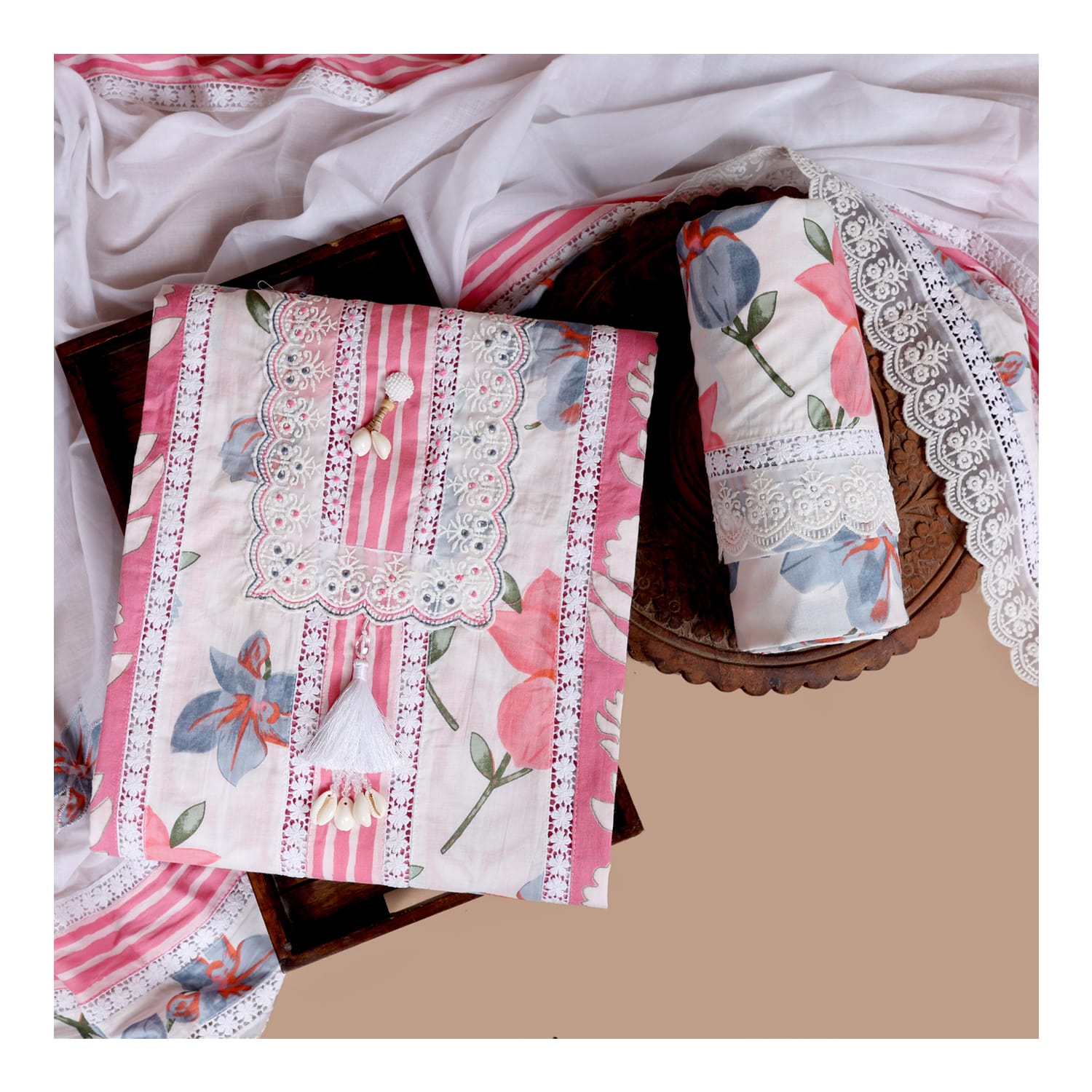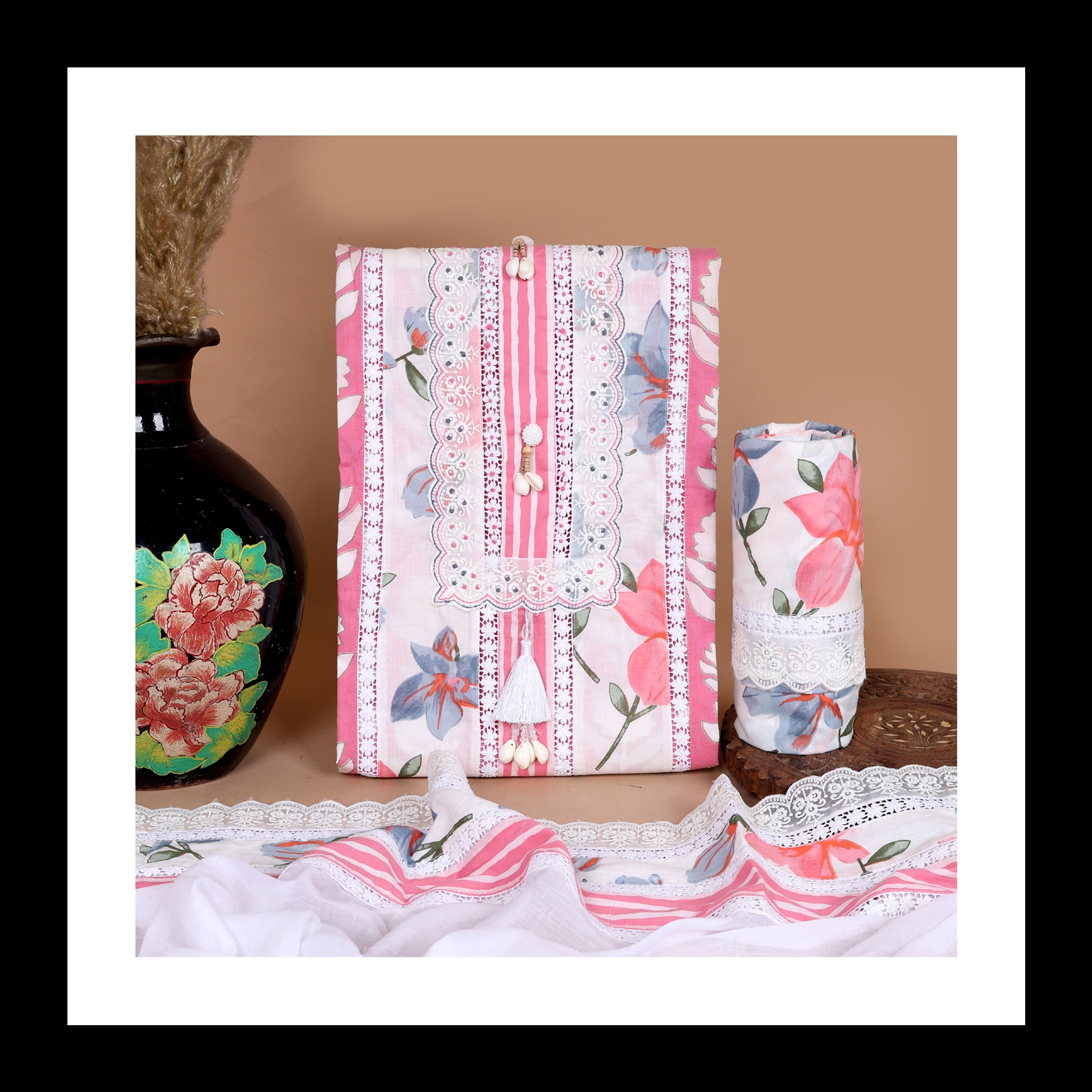 Make a graceful statement with this beautifully designed 3-piece unstitched suit, blending classic floral elegance with modern charm. Crafted from soft, breathable fabric, the suit features a stunning pink and white color palette with intricate floral prints, delicate lace detailing, and a traditionally styled neckline adorned with buttons and tassels. The set includes a printed shirt, matching dupatta, and trousers, offering you the perfect canvas to tailor your ideal outfit.